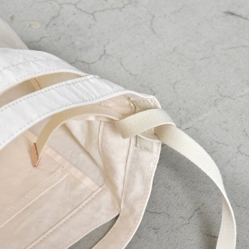 ショルダーとトートの2WAYで使いやすい小さめのバッグは、職人のこだわりと技術が詰まった生地を使っています。500mlのペットボトルやA5サイズのものが入れられる大きさです。ショルダーの長さは結び目によって調整可能で普段使いはもちろん、旅先で使う街歩き用のサブバッグとしてもおすすめ。シンプルな分、様々なコーディネートに取り入れやすく、綿のバッグでは珍しい経年変化も楽しんでいただけます。